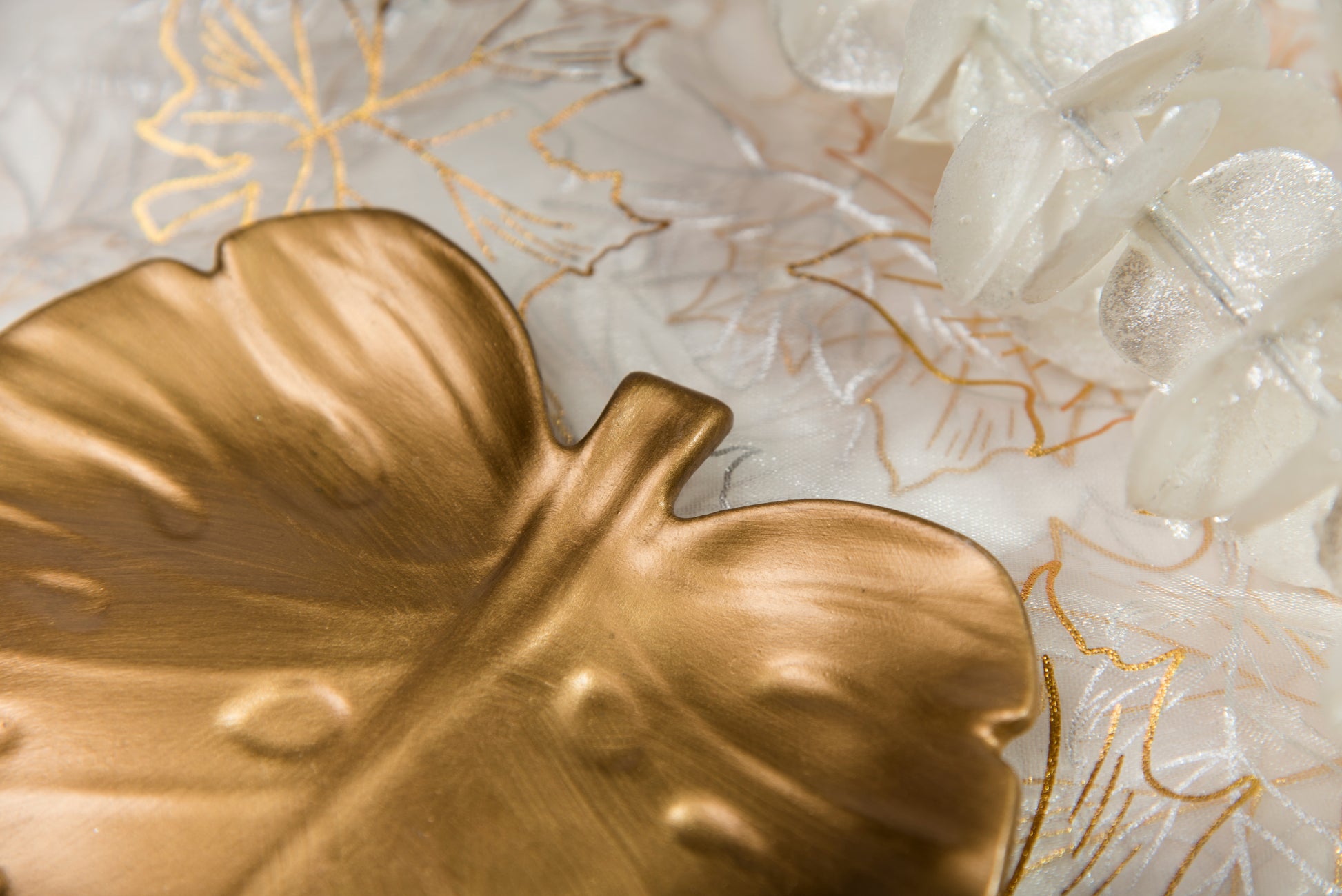 Vassoio in eco-resina, dall’effetto ceramica, composto da una polvere di resina acrilica ed acqua, con finitura metallizzata dipinta a mano.